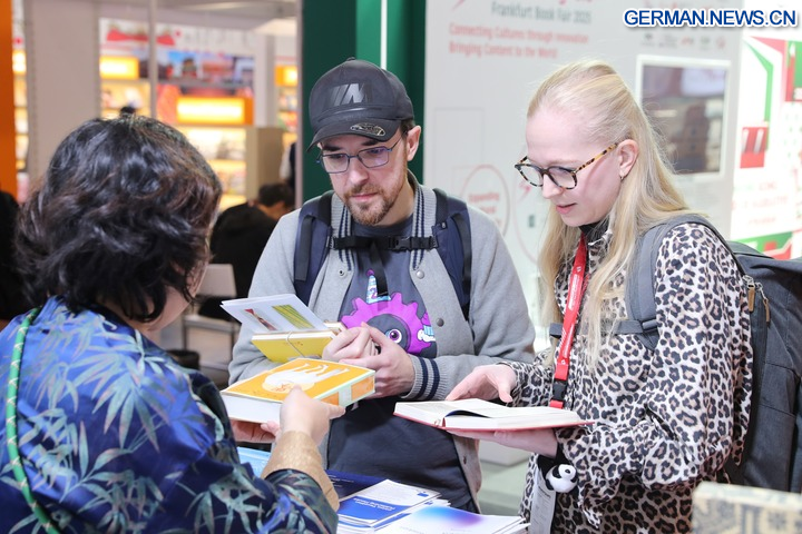 FRANKFURT, 17. Oktober 2025 (Xinhua) -- Das Foto zeigt Besucher auf der Frankfurter Buchmesse, 16. Oktober 2025. Die weltweit größte Buchmesse, die Frankfurter Buchmesse, wurde am Dienstag mit dem Schwerpunkt auf Lizenz- und Rechtehandel eröffnet.