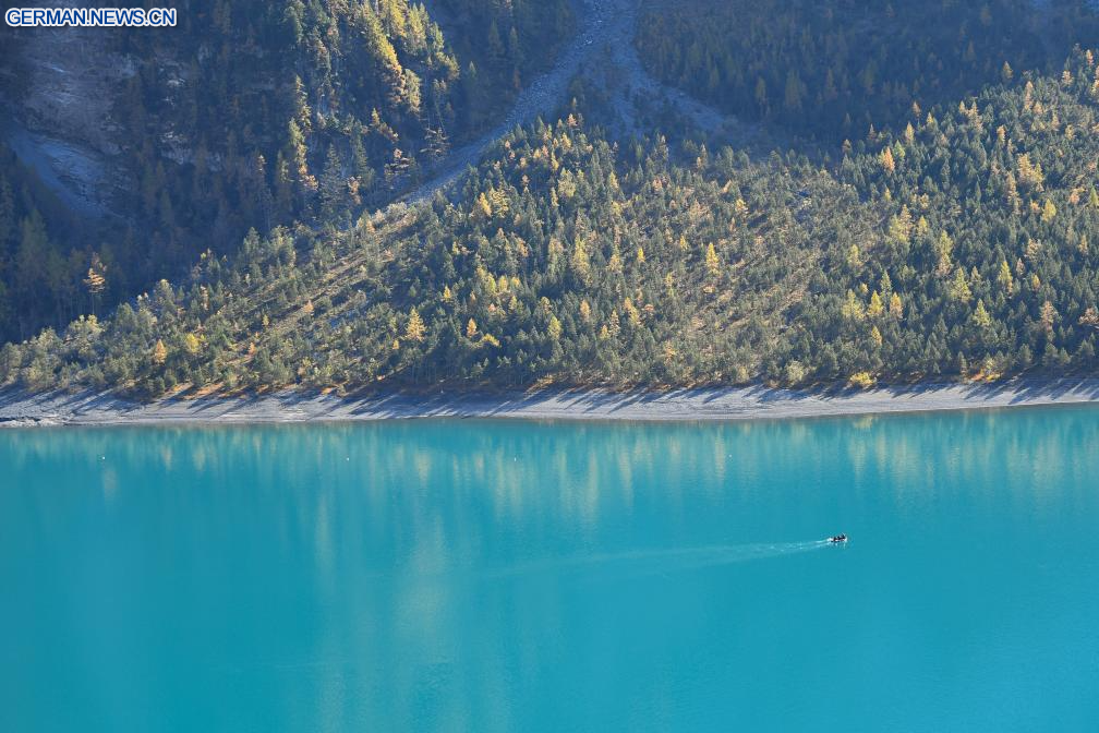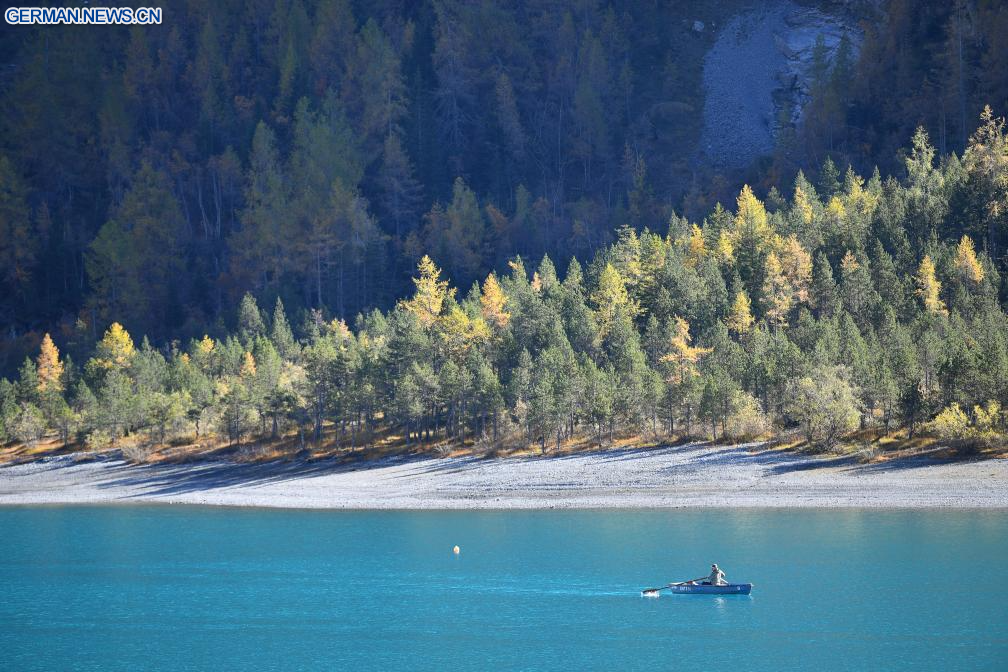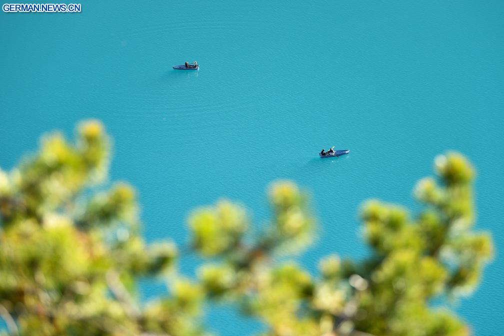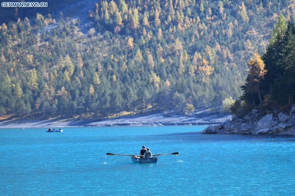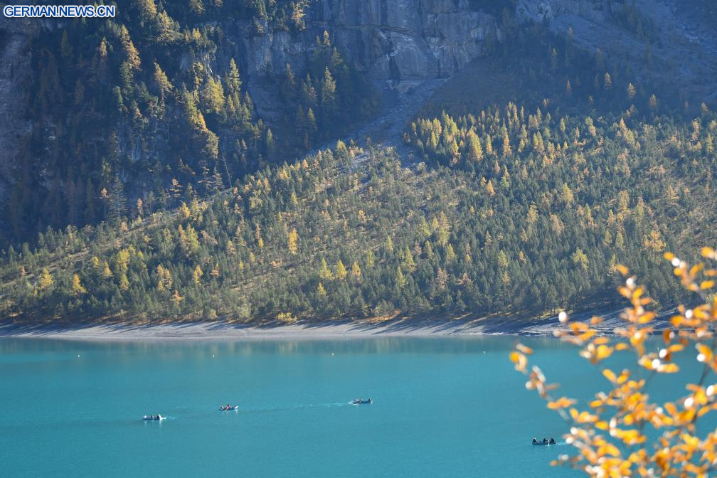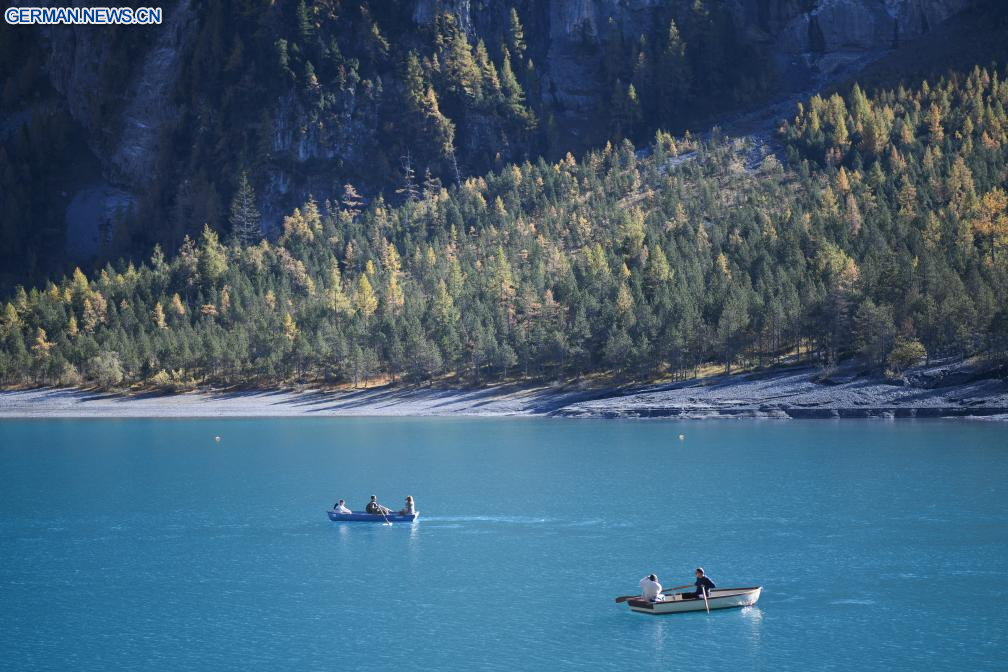 KANDERSTEG, 19. Oktober 2025 (Xinhuanet) -- Menschen fahren mit dem Boot auf dem Oeschinensee in der Nähe von Kandersteg im Berner Oberland in der Schweiz, 18. Oktober 2025.
