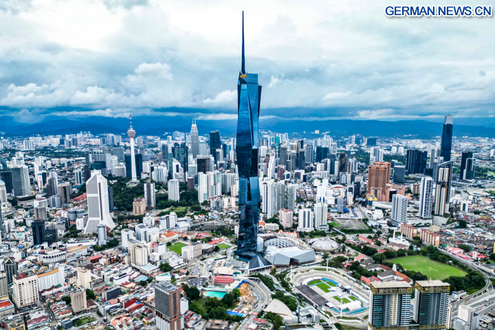 Die Luftaufnahme einer Drohne zeigt Merdeka 118, den Veranstaltungsort für die Wirtschafts- und Handelsgespräche zwischen China und den USA in der malaysischen Hauptstadt Kuala Lumpur, 24. Oktober 2025.