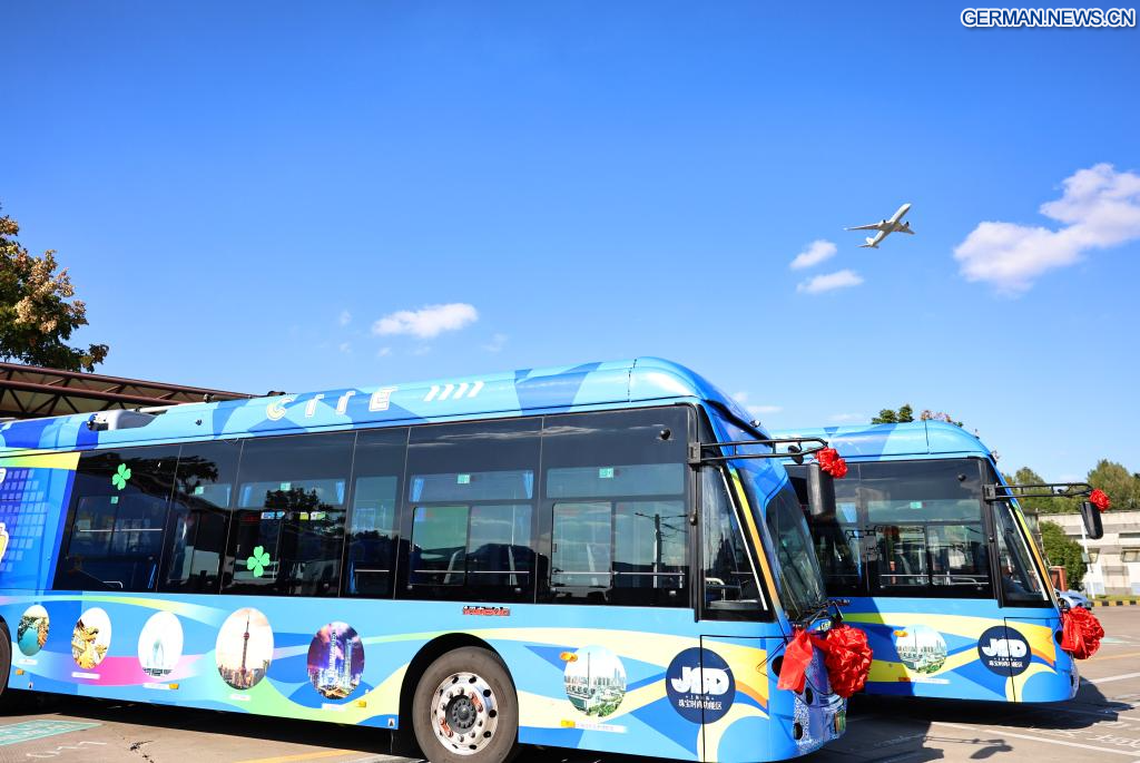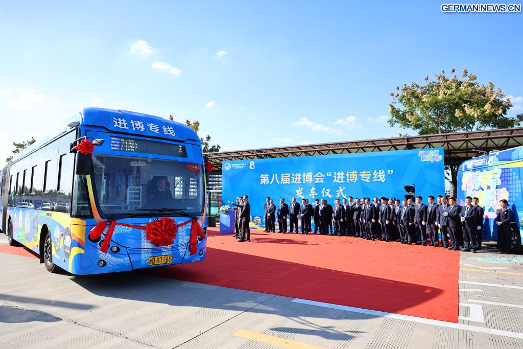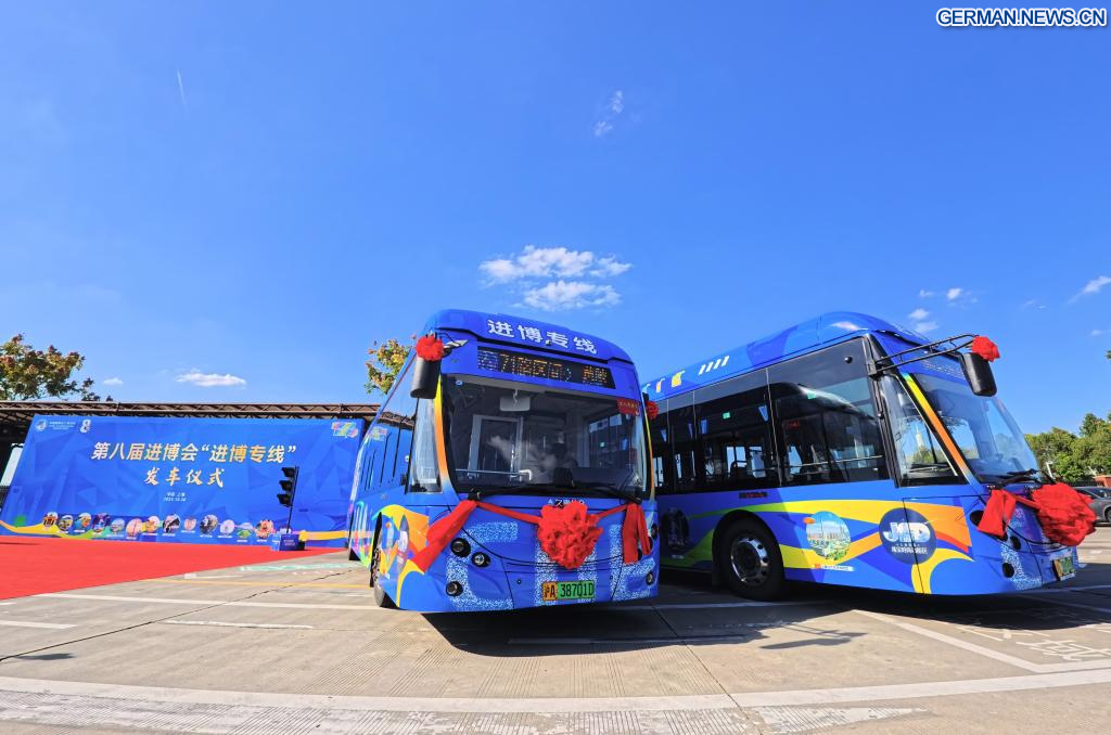 SHANGHAI, 29. Oktober 2025 (Xinhuanet) -- Ein Bus der Sonderlinie der 8. Internationalen Importmesse Chinas (CIIE) ist bei der Eröffnungsfeier im ostchinesischen Shanghai zu sehen, 29. Oktober 2025. Die Sonderlinie der 8. CIIE wurde in Shanghai eingeführt und ist vom 1. bis 30. November in Betrieb. Die Busse in Blau verkehren zwischen dem Bund und dem National Exhibition and Convention Center (Shanghai) und bieten zusätzliche Touren zu einigen beliebten Stadtteilen. (Quelle: Xinhua/Fang Zhe)