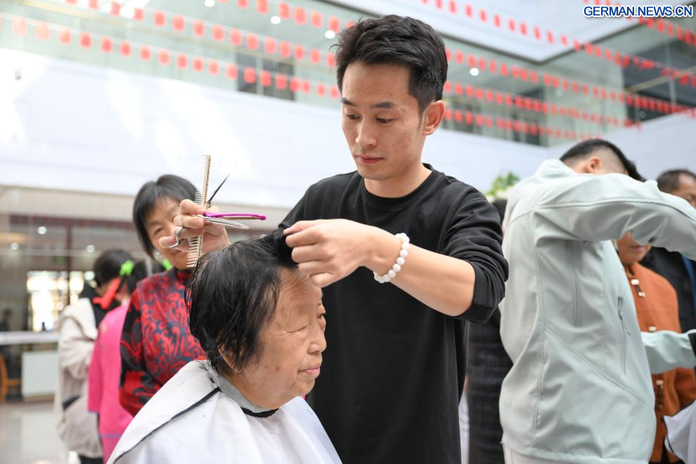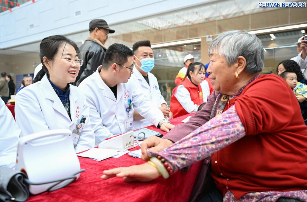 ERDOS, 29. Oktober 2025 (Xinhuanet) -- Medizinisches Personal nimmt an einer kostenlosen Klinikveranstaltung zum Chongyang-Fest in einer Gemeinde in Erdos in der nordchinesischen Autonomen Region Innere Mongolei teil, 29. Oktober 2025. Das Doppel-Neun-Fest, auch bekannt als Chongyang-Fest, wird am neunten Tag des neunten Mondmonats gefeiert und fällt dieses Jahr auf diesen Mittwoch. Es ist eine Gelegenheit, älteren Menschen in China Aufmerksamkeit zu schenken und ihnen Segenswünsche zu übermitteln. (Quelle: Xinhua/Bei He)