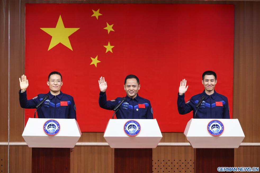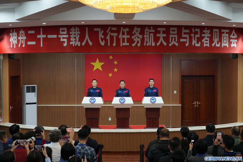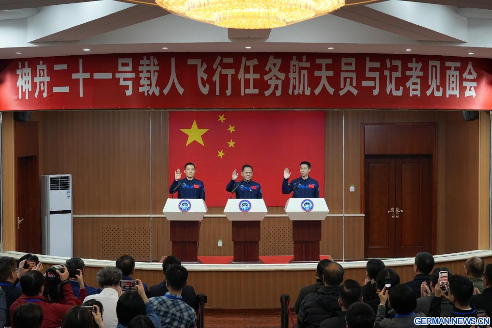JIUQUAN, 30. Oktober 2025 (Xinhuanet) -- Die chinesischen Astronauten Zhang Lu (M.), Wu Fei (r.) und Zhang Hongzhang für die bevorstehende Raumflugmission „Shenzhou-21“ treffen die Presse im Weltraumbahnhof Jiuquan Satellite Launch Center in Nordwestchina, 30. Oktober 2025. (Quelle: Xinhua/Li Zhipeng)