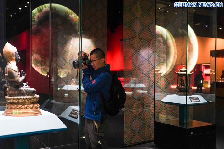 LHASA, 2. November 2025 (Xinhua) -- Ein Tourist besucht eine Ausstellung im Xizang-Museum in Lhasa im Südwesten des autonomen Gebiets Xizang in China, 30. Oktober 2025. Anlässlich des 60. Jahrestags der Gründung des autonomen Gebiets findet in Lhasa eine gemeinsame Ausstellung mit Kulturgütern aus dem Palastmuseum, dem Xizang-Museum, dem Potala-Palast und dem Norbulingka statt. Die Ausstellung dauert bis zum 1. Dezember. (Xinhua/Zhou Jiayi)