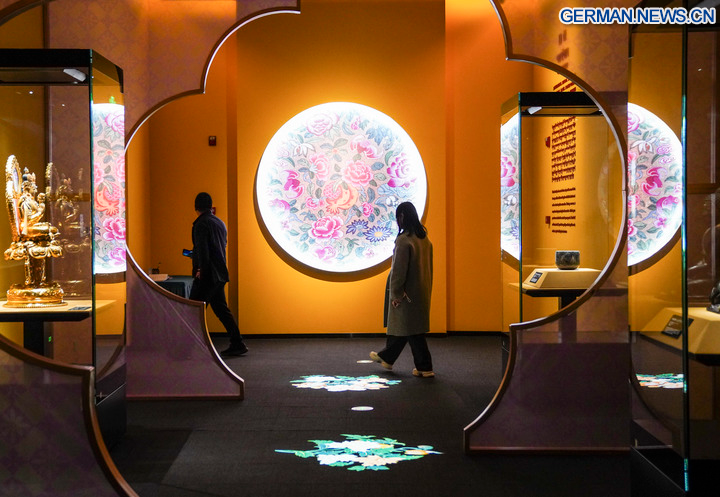 LHASA, 2. November 2025 (Xinhua) -- Eine Touristin besucht eine Ausstellung im Xizang-Museum in Lhasa im Südwesten des autonomen Gebiets Xizang in China, 30. Oktober 2025. Anlässlich des 60. Jahrestags der Gründung des autonomen Gebiets findet in Lhasa eine gemeinsame Ausstellung mit Kulturgütern aus dem Palastmuseum, dem Xizang-Museum, dem Potala-Palast und dem Norbulingka statt. Die Ausstellung dauert bis zum 1. Dezember. (Xinhua/Zhou Jiayi)