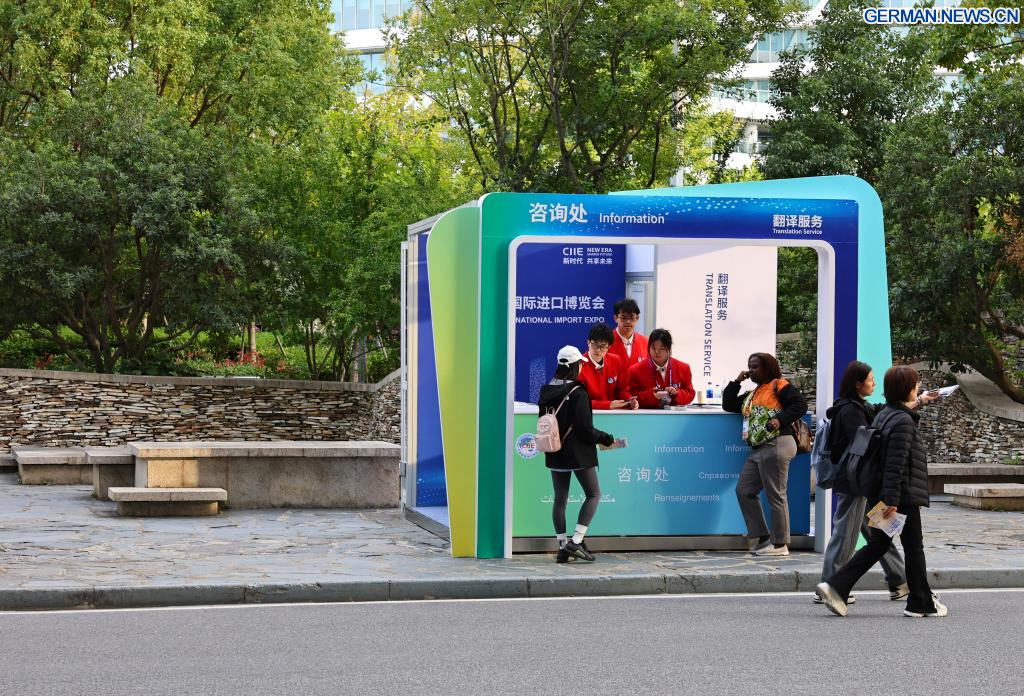 SHANGHAI, 3. November 2025 (Xinhuanet) -- Freiwillige arbeiten an einem Informationsstand im National Exhibition and Convention Center (Shanghai), dem Hauptveranstaltungsort der achten Internationalen Importmesse Chinas (CIIE), im ostchinesischen Shanghai, 3. November 2025. Die achte CIIE soll vom 5. bis 10. November in Shanghai stattfinden. An der diesjährigen Veranstaltung nehmen 4.108 Aussteller aus 155 Ländern, Regionen und internationalen Organisationen teil. Die Gesamtausstellungsfläche übersteigt 430.000 Quadratmeter und erreicht damit einen neuen Rekord. (Quelle: Xinhua/Fang Zhe)