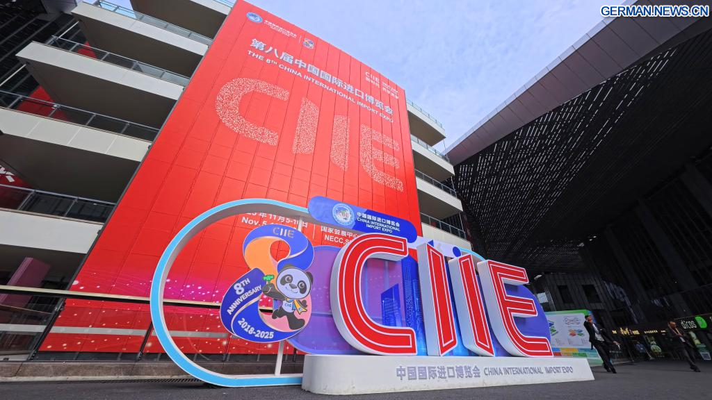 SHANGHAI, 3. November 2025 (Xinhuanet) -- Das Foto vom 3. November 2025 zeigt eine Themendekoration für die Internationale Importmesse Chinas (CIIE) im National Exhibition and Convention Center (Shanghai) im ostchinesischen Shanghai. Die achte CIIE soll vom 5. bis 10. November in Shanghai stattfinden. An der diesjährigen Veranstaltung nehmen 4.108 Aussteller aus 155 Ländern, Regionen und internationalen Organisationen teil. Die Gesamtausstellungsfläche übersteigt 430.000 Quadratmeter und erreicht damit einen neuen Rekord. (Quelle: Xinhua/Fang Zhe)