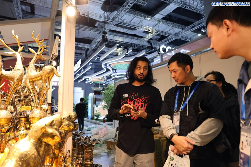 SHANGHAI, 3. November 2025 (Xinhuanet) -- Ein pakistanischer Händler (links) spricht mit Mitarbeitern bei den Vorbereitungen für die bald beginnende achte Internationale Importmesse Chinas (CIIE) im ostchinesischen Shanghai, 3. November 2025. Die achte CIIE soll vom 5. bis 10. November in Shanghai stattfinden. An der diesjährigen Veranstaltung nehmen 4.108 Aussteller aus 155 Ländern, Regionen und internationalen Organisationen teil. Die Gesamtausstellungsfläche übersteigt 430.000 Quadratmeter und erreicht damit einen neuen Rekord. (Quelle: Xinhua/Fang Zhe)