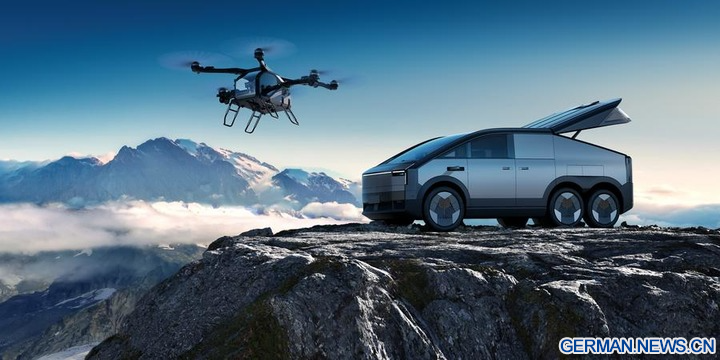 Die Darstellung zeigt das modulare fliegende Auto „Land Aircraft Carrier“ von XPENG AEROHT, der Tochtergesellschaft des Elektrofahrzeugherstellers XPENG, die sich auf fliegende Autos spezialisiert hat. (XPENG AEROHT/Handout via Xinhua)