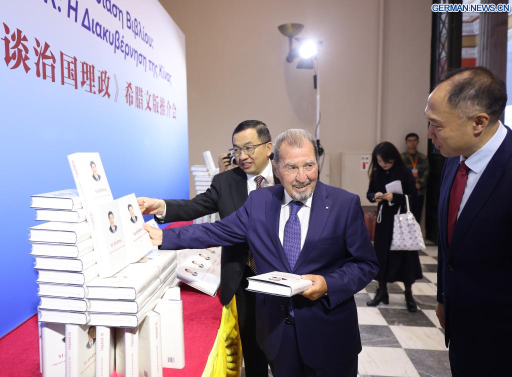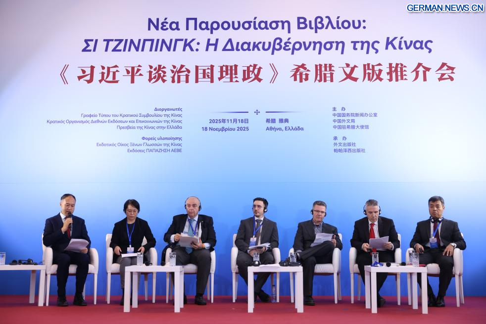 ATHEN, 19. November 2025 (Xinhuanet) -- Teilnehmer nehmen an einer Zeremonie zur Vorstellung der griechischen Ausgabe von „Xi Jinping: China regieren“ in Athen, Griechenland, teil, 18. November 2025. (Foto von Lefteris Partsalis/Xinhua)