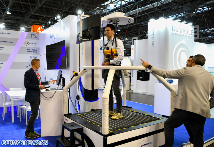 DÜSSELDORF, 20. November 2025 (Xinhua) -- Ein Besucher testet ein Rehabilitationsgerät auf der Medica 2025 in Düsseldorf, 17. November 2025. In Düsseldorf begann am Montag eine bedeutende Messe für Medizinprodukte, an der mehr als 1300 chinesische Unternehmen teilnehmen.