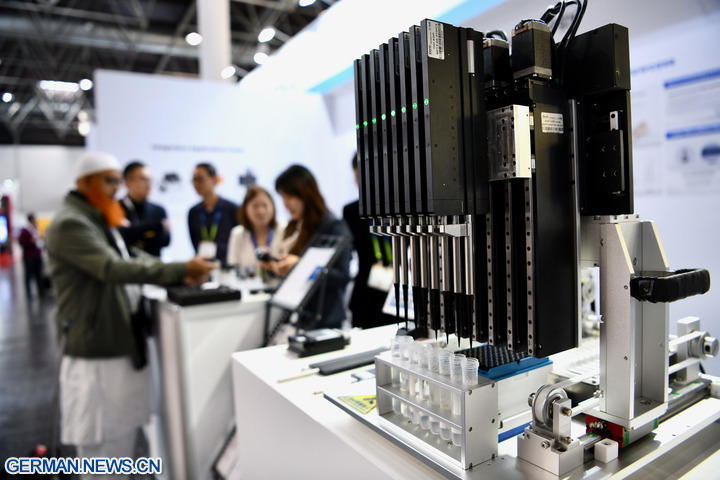 DÜSSELDORF, 20. November 2025 (Xinhua) -- Das Foto zeigt eine automatische Pipettiermaschine im Ausstellungsbereich von Keyto auf der Medica 2025 in Düsseldorf, 17. November 2025. In Düsseldorf begann am Montag eine bedeutende Messe für Medizinprodukte, an der mehr als 1300 chinesische Unternehmen teilnehmen.