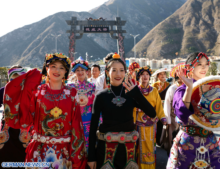 WENCHUAN, 21. November 2025 (Xinhua) -- Das Foto zeigt Frauen in ethnischer Tracht bei einer Veranstaltung zur Feier des Qiang-Neujahrs im Kreis Wenchuan in der Autonomen Präfektur Aba der Tibeter und Qiang in der Provinz Sichuan im Südwesten Chinas, 19. November 2025. Am Mittwoch fand hier eine Festveranstaltung zum Qiang-Neujahr statt, mit der eine Reihe von Aktivitäten zur Feier des Neujahrs der Qiang begann, das dieses Jahr auf den 20. November fällt.