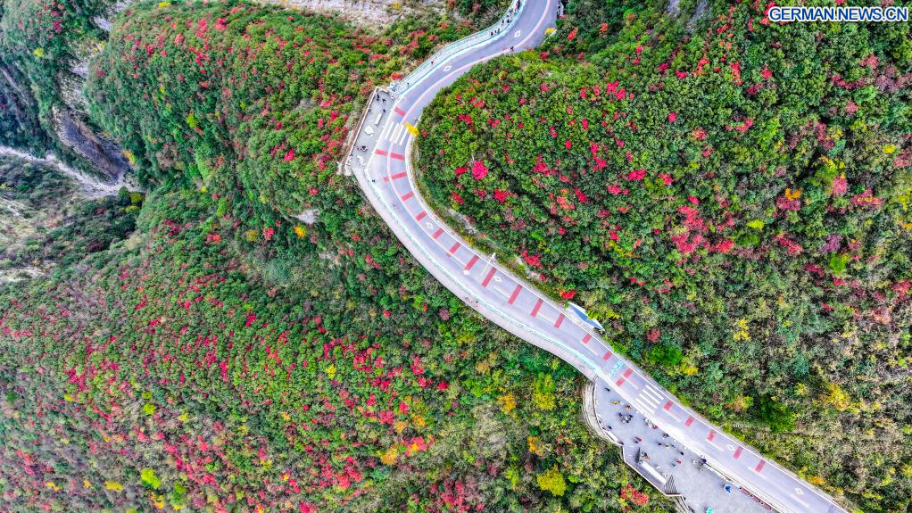CHONGQING, 22. November 2025 (Xinhuanet) -- Die Luftaufnahme einer Drohne vom 22. November 2025 zeigt Touristen an einem landschaftlich reizvollen Ort, an dem sich die Bergvegetation in der Nähe der Wuxia-Schlucht, einer der Drei Schluchten am Jangtse, rot zu färben beginnt, im Kreis Wushan im südwestchinesischen Chongqing. (Quelle: Xinhua/Wang Quanchao)