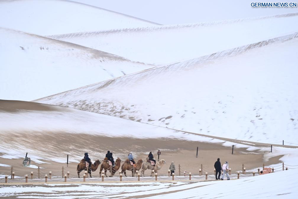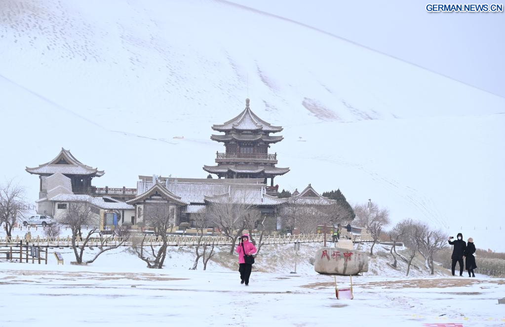 DUNHUANG, 23. November 2025 (Xinhuanet) -- Touristen besuchen das Landschaftsgebiet Mingsha-Berg und Mondsichelquelle in der Stadt Dunhuang in der nordwestchinesischen Provinz Gansu, 23. November 2025. Die bekannten Sehenswürdigkeiten in Dunhuang, die mit einer Schneedecke bedeckt sind, bieten eine atemberaubende Winterlandschaft. (Foto von Zhang Xiaoliang/Xinhua)
