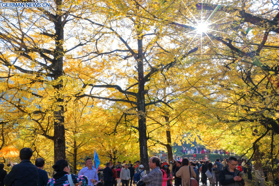 YONGZHOU, 24. November 2025 (Xinhua) -- Die Luftaufnahme einer Drohne zeigt Besucher in einem Ginkgowald im Dorf Tongziao im Kreis Shuangpai der Stadt Yongzhou in der Provinz Hunan in Zentralchina, 23. November 2025. Mehr als 3.000 Ginkgobäume haben sich hier nach und nach golden verfärbt und ziehen viele Touristen an. (Xinhua/Zhao Zhongzhi)