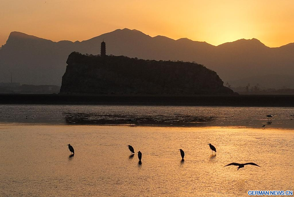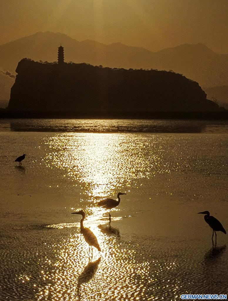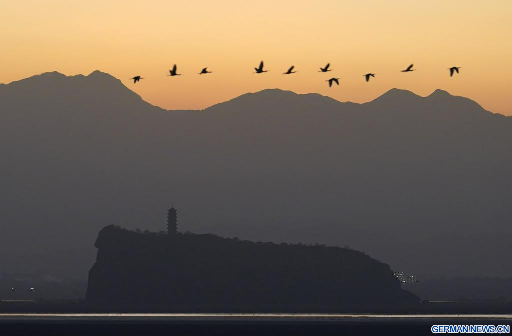 JIUJIANG, 27. November 2025 (Xinhuanet) -- Zugvögel ruhen sich auf dem Poyang-See im Kreis Hukou in der ostchinesischen Provinz Jiangxi aus,26. November 2025. (Quelle: Xinhua/Wan Xiang)