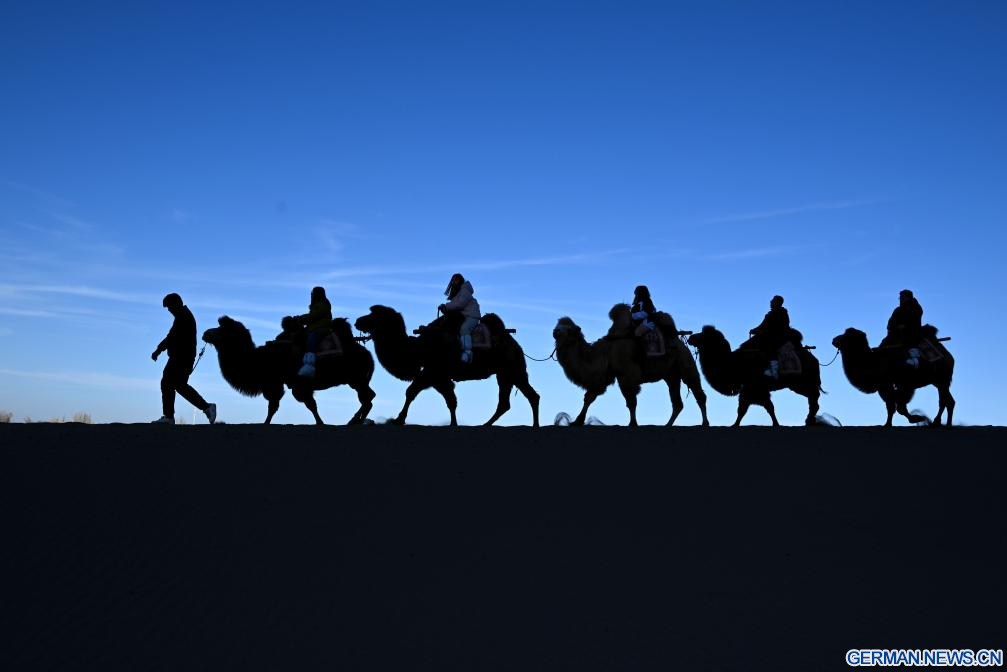 BEIJING, 30. November 2025 (Xinhuanet) -- Touristen besuchen das Landschaftsgebiet Mingsha-Berg und Mondsichelquelle in der Stadt Dunhuang in der nordwestchinesischen Provinz Gansu, 30. November 2025. (Foto von Zhang Xiaoliang/Xinhua)