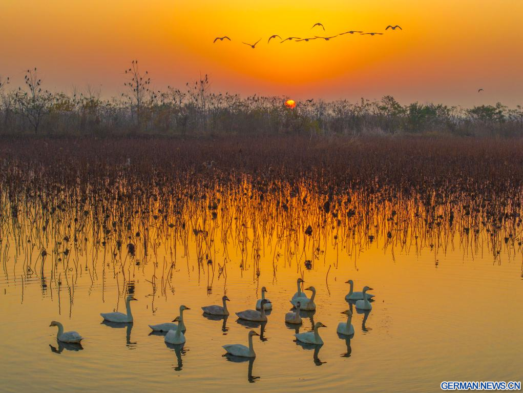 BEIJING, 30. November 2025 (Xinhuanet) -- Das Drohnenfoto zeigt einen Vogelschwarm, der in einem Feuchtgebiet in Xinghua in der ostchinesischen Provinz Jiangsu nach Nahrung sucht. (Foto von Zhou Shegen/Xinhua)