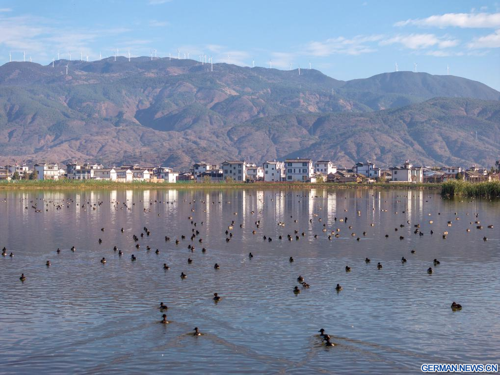 BEIJING, 30. November 2025 (Xinhuanet) -- Das Drohnenfoto zeigt einen Vogelschwarm, der in einem Feuchtgebiet im Kreis Eryuan in der Autonomen Präfektur Dali der Bai in der südwestchinesischen Provinz Yunnan nach Nahrung sucht, 30. November 2025. (Foto von Luo Xincai/Xinhua)