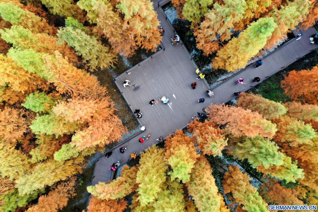 BEIJING, 30. November 2025 (Xinhuanet) -- Die Luftaufnahme einer Drohne zeigt Menschen, die sich in einem Feuchtgebietspark im Bezirk Bozhou der Stadt Zunyi in der südwestchinesischen Provinz Guizhou vergnügen, 30. November 2025. (Foto von Li Renjun/Xinhua)
