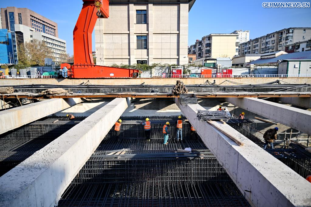 SHIJIAZHUANG, 8. Dezember (Xinhuanet) -- Arbeiter binden Stahlstangen auf einer Baustelle der U-Bahn-Linie 5 in Shijiazhuang in der nordchinesischen Provinz Hebei, 9. Dezember 2025. Der Bau der U-Bahn-Linie 5 in Shijiazhuang schreitet stetig voran, mehrere Abschnitte wurden bereits in zwei Richtungen durchbohrt. (Quelle: Xinhua/Mu Yu)