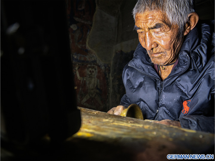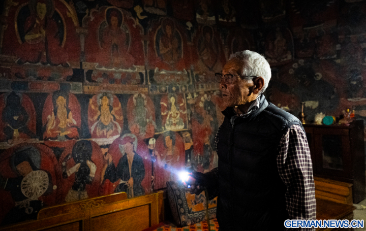 LHASA, 11. Dezember 2025 (Xinhua) -- Rigzin Wangzhab überprüft die Piyang-Grotten auf Wassereintritt oder Einsturzgefahr im Kreis Zanda der Präfektur Ngari im Autonomen Gebiet Xizang im Südwesten Chinas, 24. Juni 2025. (Xinhua/Tenzin Nyida)