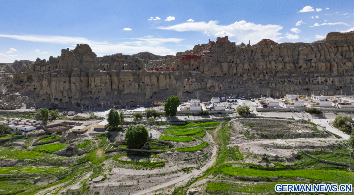 LHASA, 11. Dezember 2025 (Xinhua) -- Die Luftaufnahme einer Drohne zeigt die Piyang-Grotten und ein Dorf unterhalb im Kreis Zanda der Präfektur Ngari im Autonomen Gebiet Xizang im Südwesten Chinas, 24. Juni 2025. (Xinhua/Tenzin Nyida)
