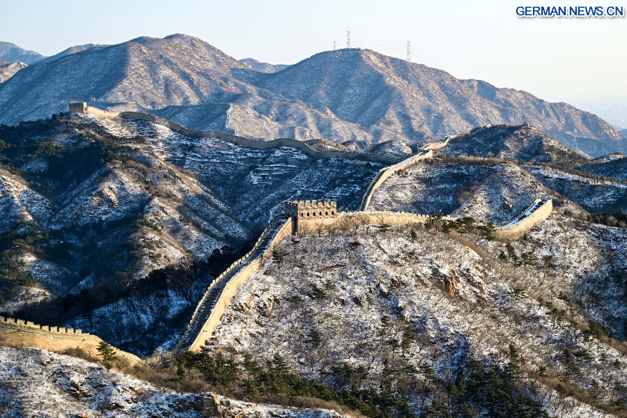 BEIJING, 14. Dezember 2025 (Xinhua) -- Die Luftaufnahme einer Drohne zeigt die verschneite Landschaft an einem Abschnitt der Großen Mauer in der nordchinesischen Provinz Hebei, 13. Dezember 2025. (Foto: Liu Mancang/Xinhua)