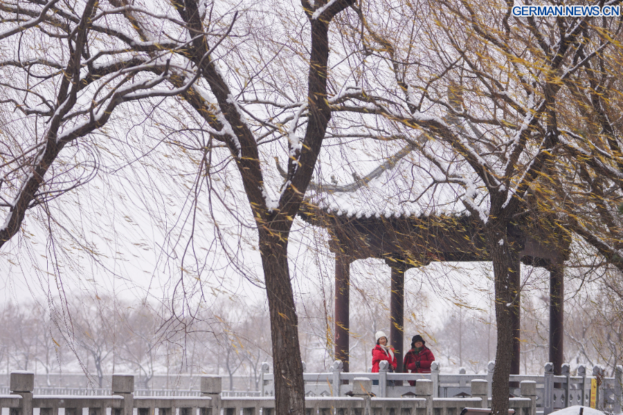 BEIJING, 14. Dezember 2025 (Xinhua) -- Menschen besuchen nach Schneefall einen malerischen Ort in Zouping in der ostchinesischen Provinz Shandong, 13. Dezember 2025. (Foto: Dong Naide/Xinhua)