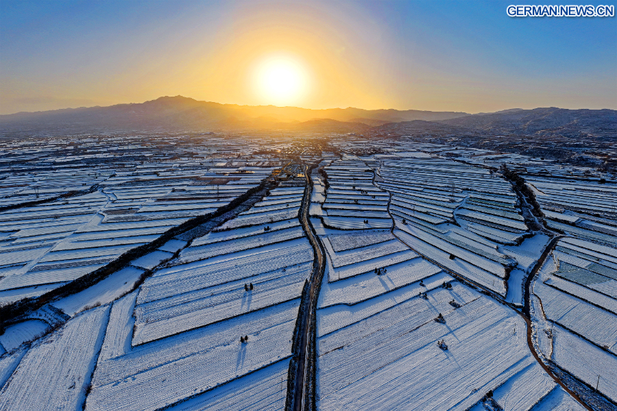 BEIJING, 14. Dezember 2025 (Xinhua) -- Die Luftaufnahme einer Drohne zeigt die schneebedeckten Terrassen in Linfen in der nordchinesischen Provinz Shanxi, 13. Dezember 2025. (Foto: Li Xianjun/Xinhua)