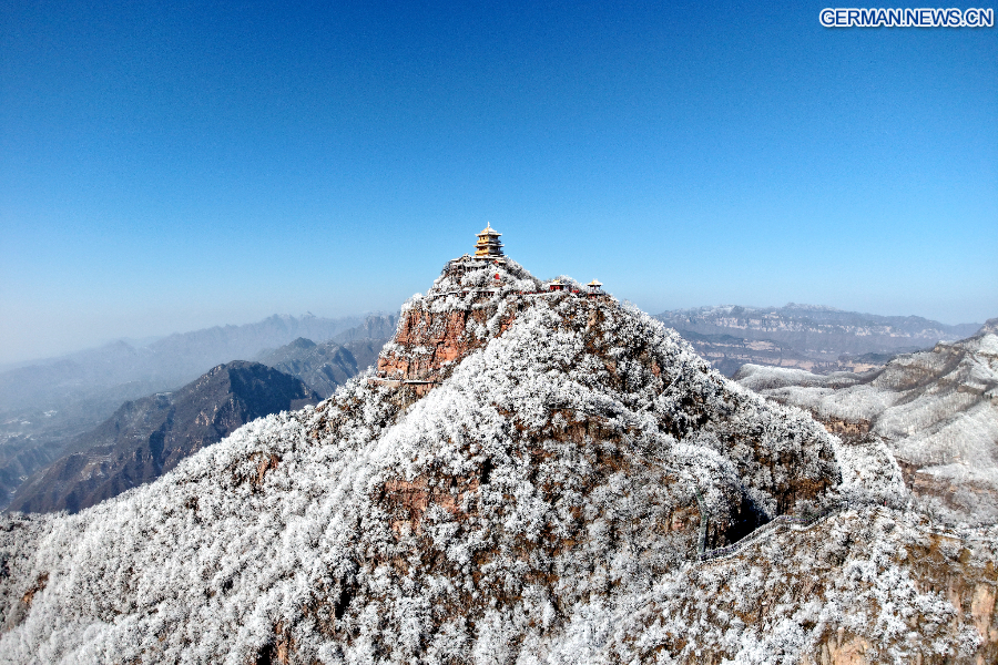 BEIJING, 14. Dezember 2025 (Xinhua) -- Die Drohnenaufnahme zeigt die verschneite Landschaft um den malerischen Wangwu-Berg in Jiyuan in der zentralchinesischen Provinz Henan, 13. Dezember 2025. (Foto: Duan Erping/Xinhua)
