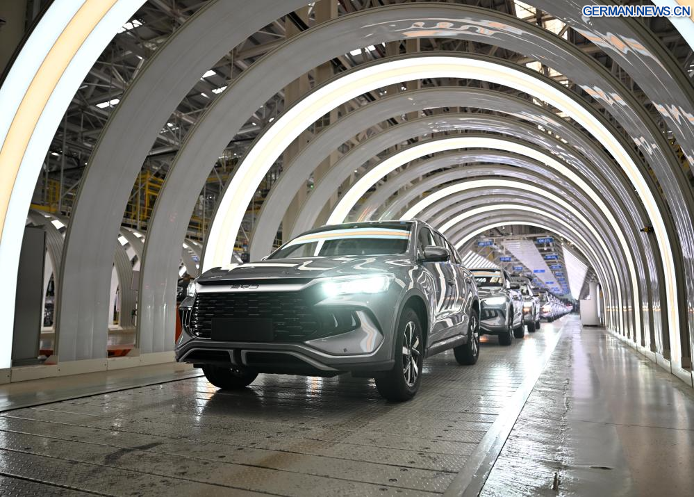 Das Foto vom 3. November 2025 zeigt eine Montagelinie für Fahrzeuge mit neuen Energien (NEV) von BYD, Chinas führendem NEV-Hersteller, im Werk von BYD in Zhengzhou in der zentralchinesischen Provinz Henan.
