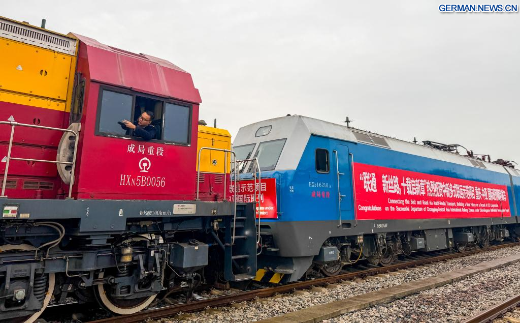 CHONGQING, 15. Dezember 2025 (Xinhuanet) -- Ein Güterzug vom Chongqing-Central Asia International Railway Express im Rahmen des multimodalen Demonstrationsprojekts China-Singapur wird vor der Abfahrt am Bahnhof Yuzui im südwestchinesischen Chongqing abgebildet, 15. Dezember 2025.