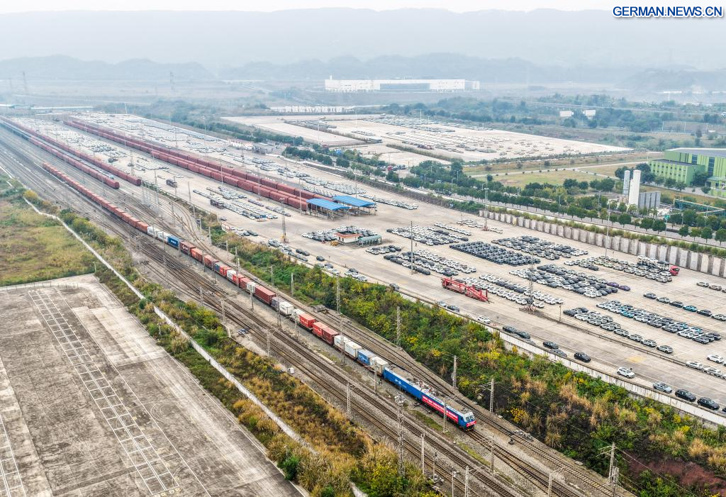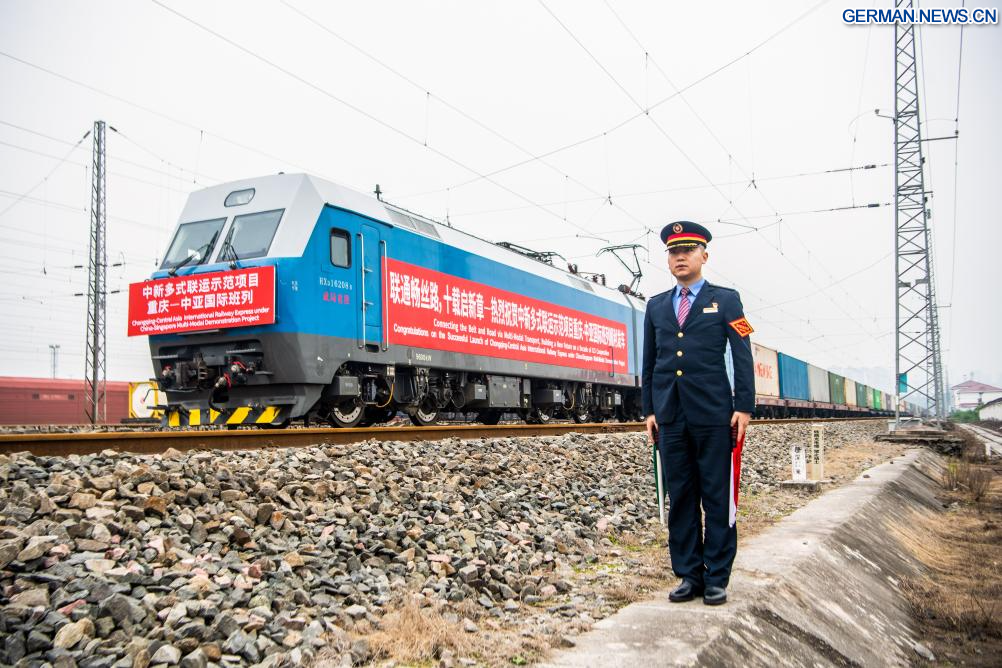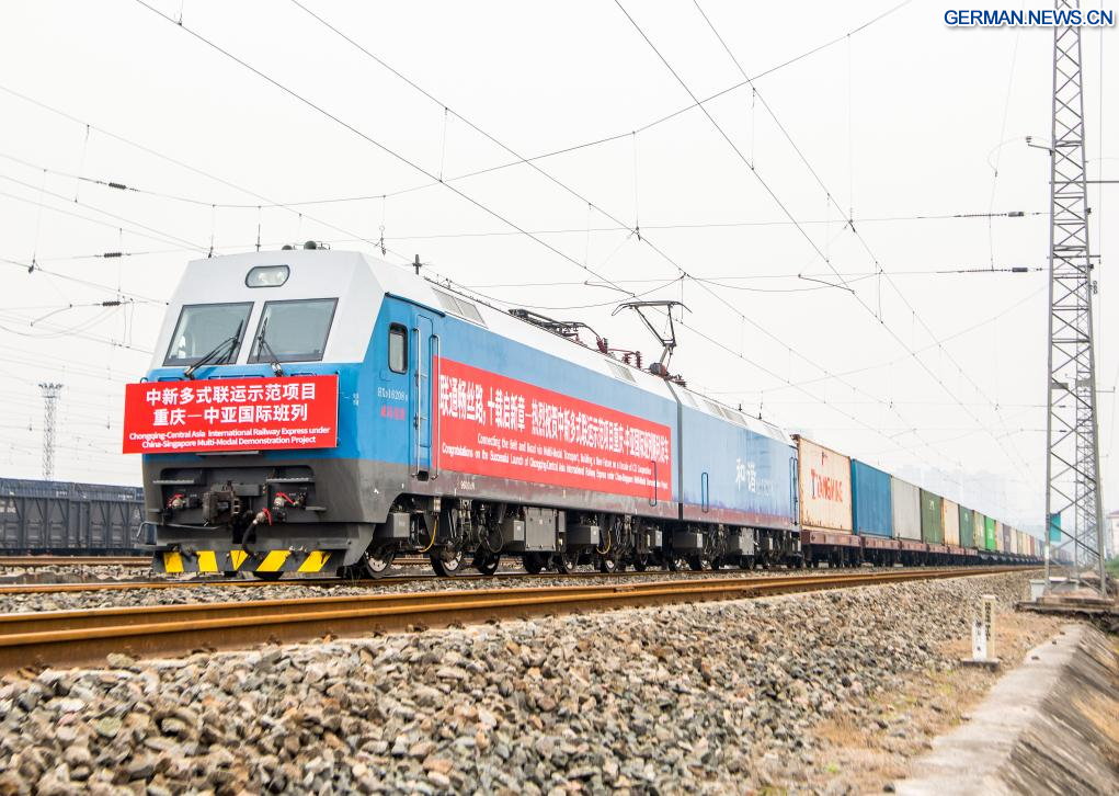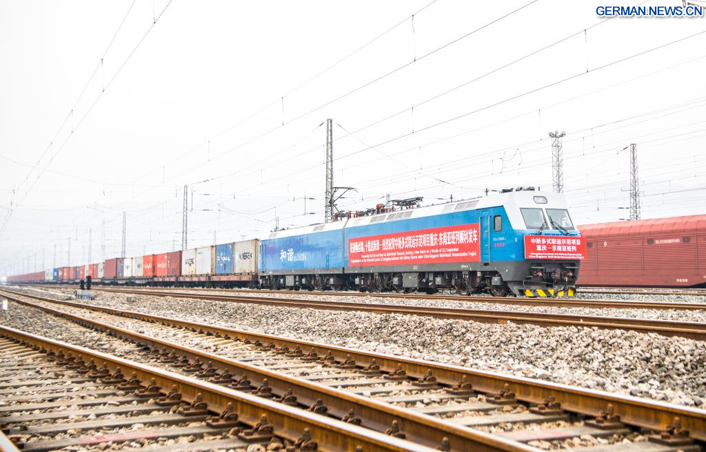 Zwei Güterzüge im Rahmen des multimodalen Demonstrationsprojekts China-Singapur sind am Montag von hier aus gestartet und fahren über den Chongqing-Southeast Asia Railway Express nach Singapur bzw. über den Chongqing-Central Asia International Railway Express nach Kasachstan.
