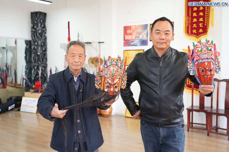 GUIYANG, 15. Dezember (Xinhua) -- Seit Jahrhunderten fasziniert die Welt jenseits der Karsthügel die Bewohner des Dorfes Malu. Aber sie müssen nicht weit reisen, um Abenteuer zu erleben. Stattdessen können sie die lackierten Holzmasken der Dixi-Oper aufsetzen und legendäre Feldherren oder Militärberater auf historischen Schlachtfeldern verkörpern.