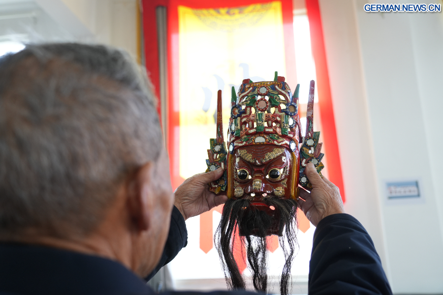 GUIYANG, 15. Dezember 2025 (Xinhua) -- Ein Dorfbewohner begutachtet eine lackierte Holzmaske der Dixi-Oper im Dorf Malu in der Autonomen Präfektur Qiannan der Buyi und Miao in der Provinz Guizhou im Südwesten Chinas, 20. November 2025. (Xinhua)