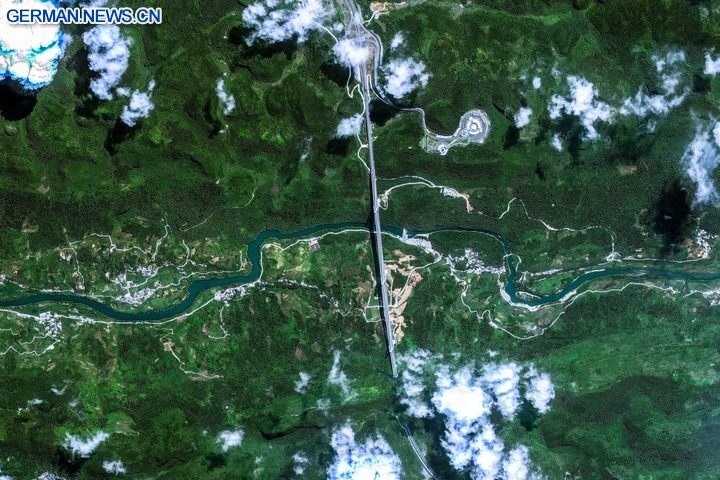 GUIYANG, 16. Dezember 2025 (Xinhua) -- Die Satellitenaufnahme zeigt die Pingtang-Großbrücke in der Provinz Guizhou im Südwesten Chinas, 15. August 2022.