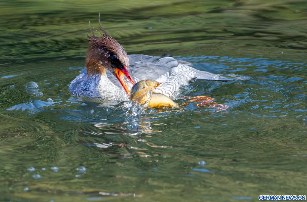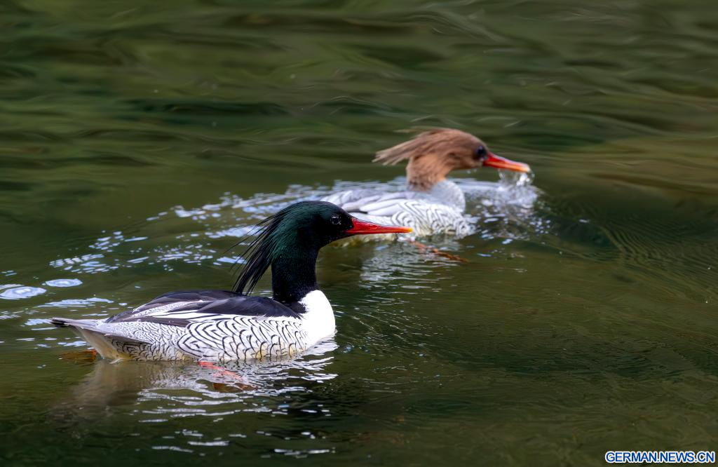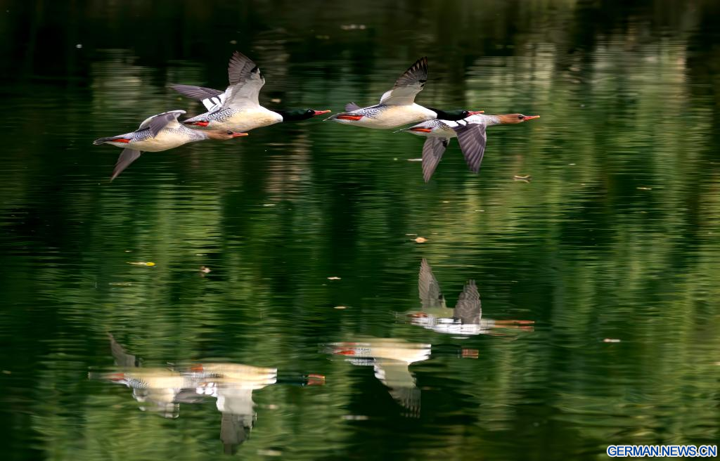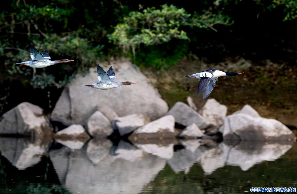 FUZHOU, 21. Dezember 2025 (Xinhuanet) -- Chinesische Gänsesäger fliegen über dem Dazhang-Fluss im Kreis Yongtai in der südostchinesischen Provinz Fujian, 20. Dezember 2025. Sechzehn chinesische Gänsesäger, eine Tierart, die unter nationalem Schutz der ersten Kategorie steht, wurden hier beim Überwintern gesichtet. (Quelle: Xinhua/Wei Peiquan)