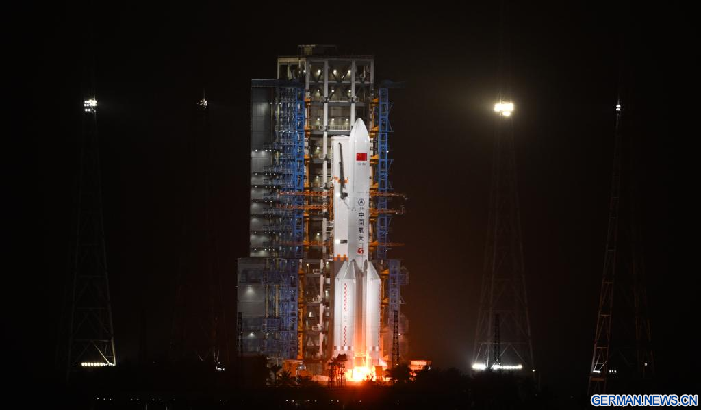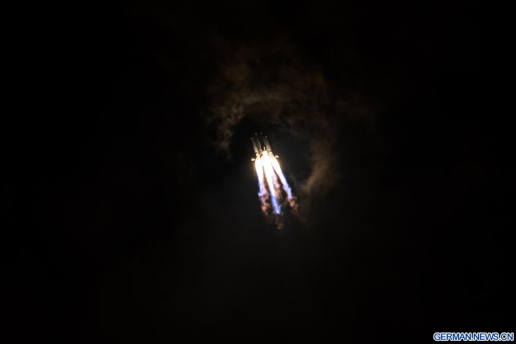 WENCHANG, 20. Dezember 2025 (Xinhuanet) -- Eine Rakete vom Typ „Langer Marsch-5“ mit einem neuen Testsatelliten für Kommunikationstechnologie an Bord startet vom Weltraumbahnhof Wenchang Space Launch Site in der südchinesischen Provinz Hainan, 20. Dezember 2025. Der Satellit wurde um 20:30 Uhr Ortszeit Beijing gestartet und ist erfolgreich in die vorgegebene Umlaufbahn eingetreten.