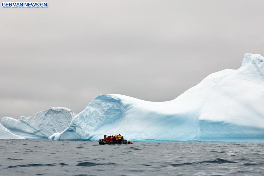 Menschen fotografieren einen Eisberg in der Nähe der Küste von Spert Island in der Antarktis, 16. Dezember 2025. (Foto: Yang Shu/Xinhua)
