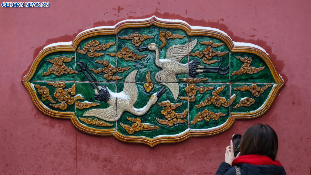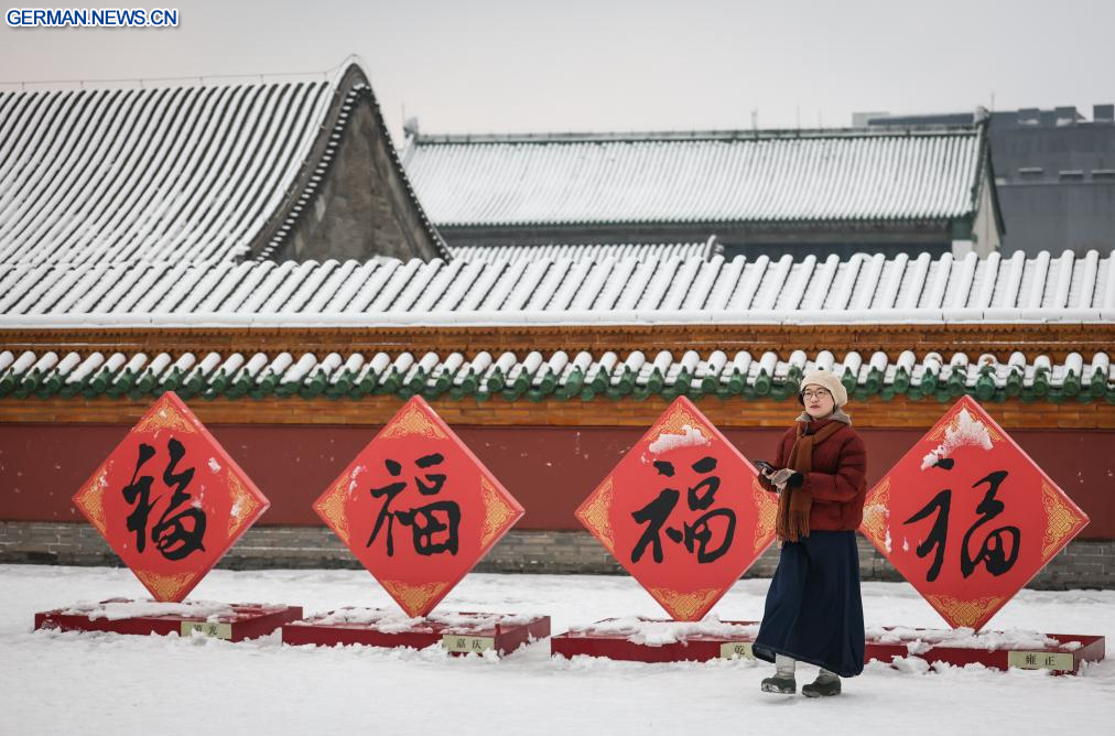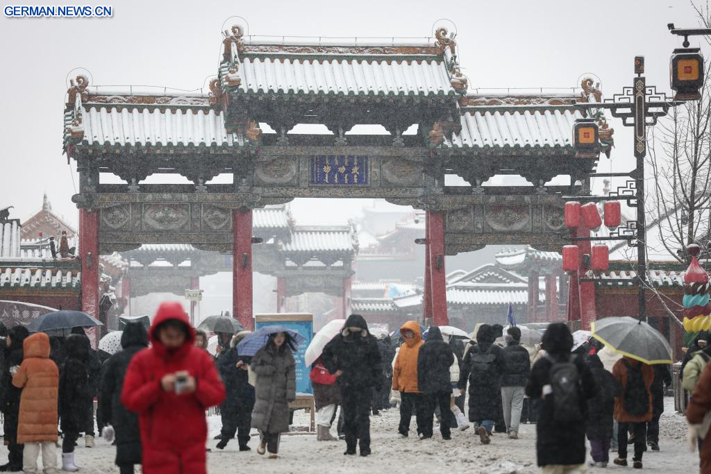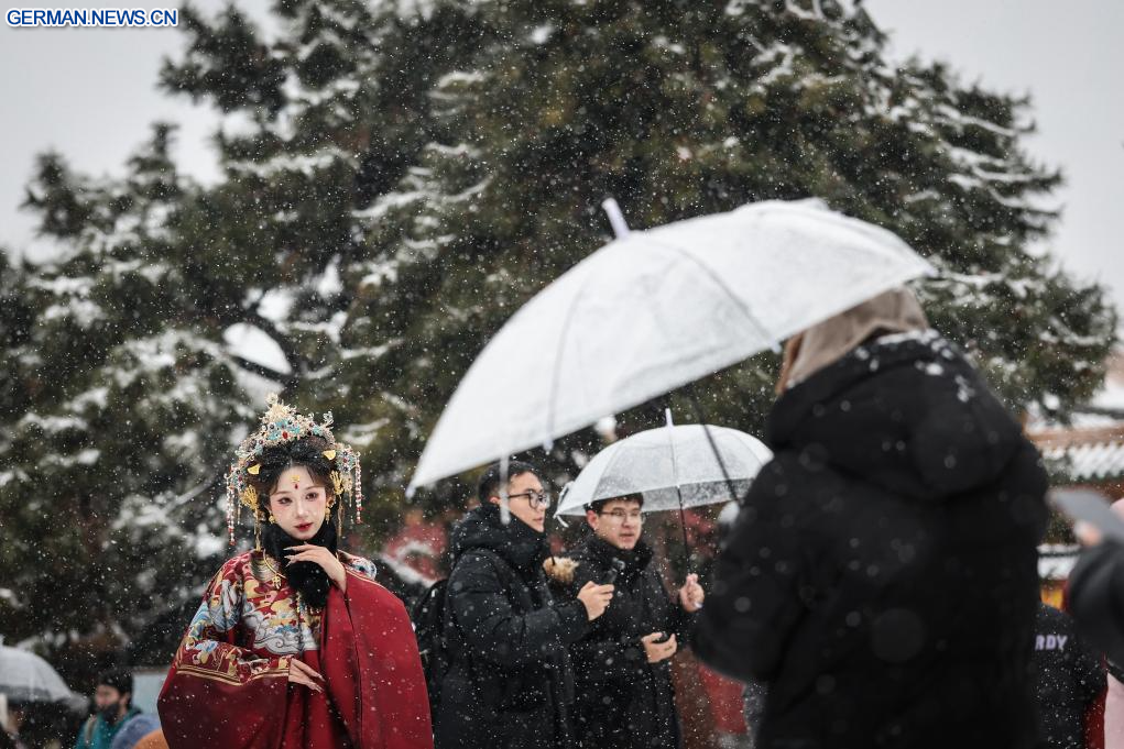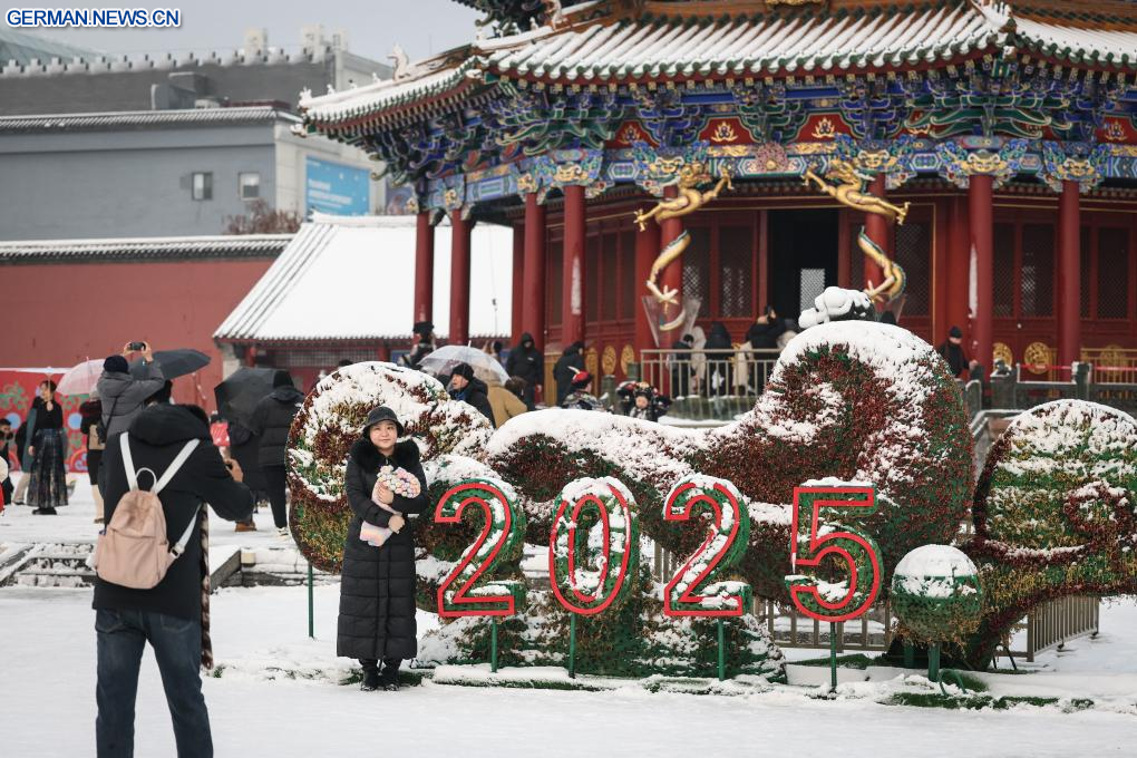 SHENYANG, 23. Dezember 2025 (Xinhuanet) -- Menschen besuchen das Shenyanger Palastmuseum in Shenyang in der nordostchinesischen Provinz Liaoning, 23. Dezember 2025. Am Dienstag fiel in der Provinz Liaoning starker Schnee. (Quelle: Xinhua/Pan Yulong)