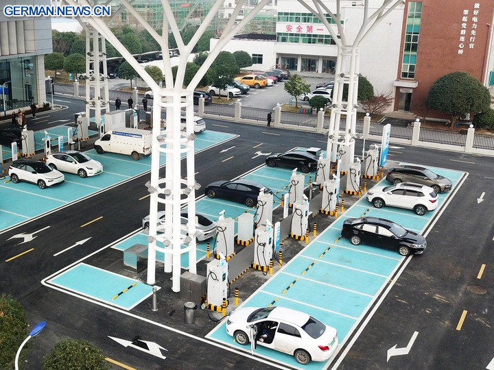 Die Luftaufnahme einer Drohne zeigt Fahrzeuge mit neuer Energie beim Aufladen an einer Ladestation im Kreis Changsha in der Provinz Hunan in Zentralchina, 8. Januar 2024. (Xinhua/Chen Zhenhai)