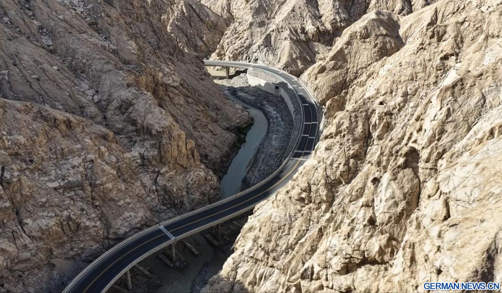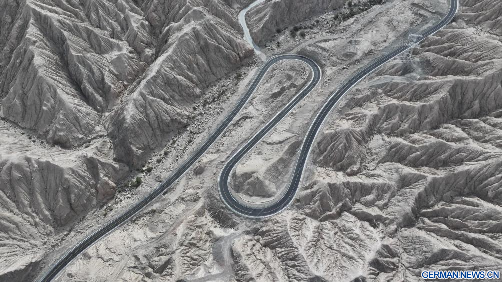 RUOQIANG, 25. Dezember 2025 (Xinhuanet) -- Die Luftaufnahme einer Drohne vom 25. Dezember 2025 zeigt eine Rohstoffstraße im Kreis Ruoqiang in der Mongolischen Autonomen Präfektur Bayingolin im Uigurischen Autonomen Gebiet Xinjiang im Nordwesten Chinas. Die insgesamt 98,45 Kilometer lange Rohstoffstraße wurde am Donnerstag offiziell für den Verkehr freigegeben. Sie beginnt in einem Industriepark im Kreis Ruoqiang, führt durch das Altun-Gebirge und verbindet die mineralreichen Gebiete im südlichen Teil des Kreises Ruoqiang. (Foto von Su Bo/Xinhua)
