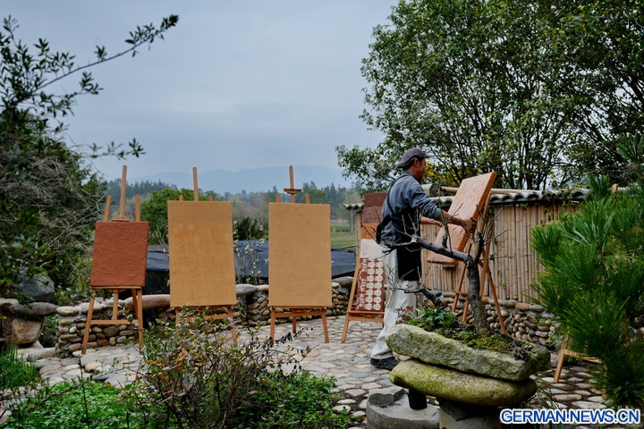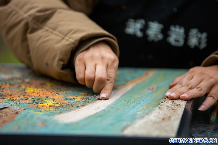 WUYISHAN, 25. Dezember 2025 (Xinhua) -- Ein Künstler bereitet Tafeln für Gesteinspigmentmalereien in der Stadt Wuyishan in der Provinz Fujian im Südosten Chinas vor, 22. Dezember 2025. Wuyishan verfügt über eine große Vielfalt an farbenfrohen Gesteinen und Erden, die als natürliche Palette für die Malerei dienen und die unverwechselbare Wuyi-Gesteinspigmentkunst hervorgebracht haben. Durch die Integration moderner künstlerischer Elemente und Techniken in die Tradition wird die Wuyi-Gesteinspigmentmalerei allmählich zu einem einzigartigen kulturellen Merkmal von Wuyishan. (Foto von Chen Ying/Xinhua)
