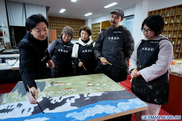 WUYISHAN, 25. Dezember 2025 (Xinhua) -- Ein Künstler arbeitet an einem Gemälde mit Farben aus Gesteinspigmenten in der Stadt Wuyishan in der Provinz Fujian im Südosten Chinas, 21. Dezember 2025. Wuyishan verfügt über eine große Vielfalt an farbenfrohen Gesteinen und Erden, die als natürliche Palette für die Malerei dienen und die unverwechselbare Wuyi-Gesteinspigmentkunst hervorgebracht haben. Durch die Integration moderner künstlerischer Elemente und Techniken in die Tradition wird die Wuyi-Gesteinspigmentmalerei allmählich zu einem einzigartigen kulturellen Merkmal von Wuyishan. (Foto von Chen Ying/Xinhua)