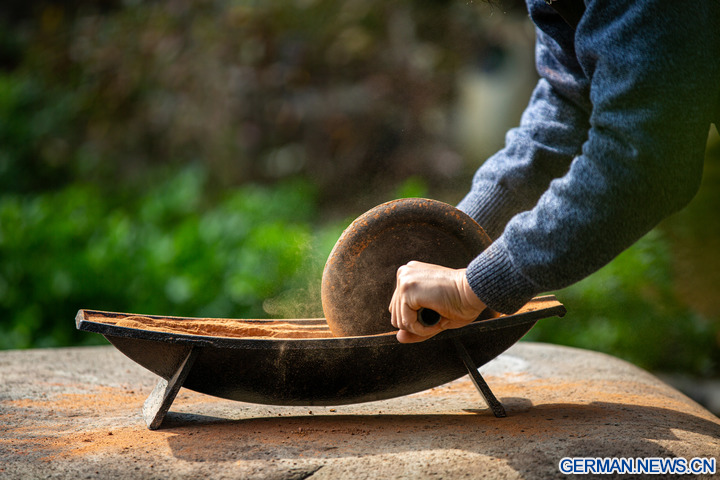 WUYISHAN, 25. Dezember 2025 (Xinhua) -- Ein Künstler zermahlt Gestein und Erde zu Pulver in der Stadt Wuyishan in der Provinz Fujian im Südosten Chinas, 19. Dezember 2025. Wuyishan verfügt über eine große Vielfalt an farbenfrohen Gesteinen und Erden, die als natürliche Palette für die Malerei dienen und die unverwechselbare Wuyi-Gesteinspigmentkunst hervorgebracht haben. Durch die Integration moderner künstlerischer Elemente und Techniken in die Tradition wird die Wuyi-Gesteinspigmentmalerei allmählich zu einem einzigartigen kulturellen Merkmal von Wuyishan. (Foto von Chen Ying/Xinhua)