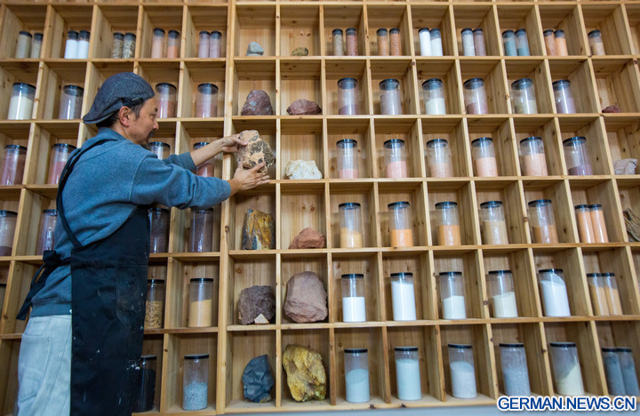 WUYISHAN, 25. Dezember 2025 (Xinhua) -- Ein Künstler ordnet Gesteinspigmente in der Stadt Wuyishan in der Provinz Fujian im Südosten Chinas, 22. Dezember 2025. Wuyishan verfügt über eine große Vielfalt an farbenfrohen Gesteinen und Erden, die als natürliche Palette für die Malerei dienen und die unverwechselbare Wuyi-Gesteinspigmentkunst hervorgebracht haben. Durch die Integration moderner künstlerischer Elemente und Techniken in die Tradition wird die Wuyi-Gesteinspigmentmalerei allmählich zu einem einzigartigen kulturellen Merkmal von Wuyishan. (Foto von Chen Ying/Xinhua)