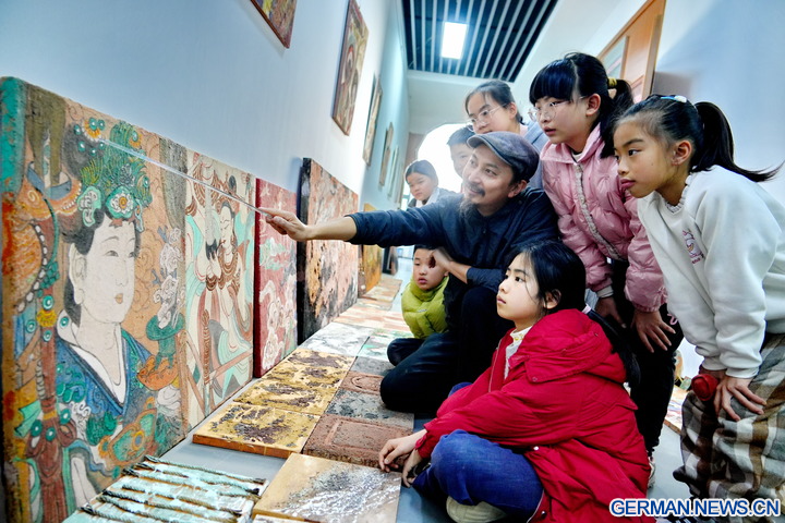 WUYISHAN, 25. Dezember 2025 (Xinhua) -- Ein Künstler unterhält sich mit Kindern über mit Gesteinspigmenten gemalte Bilder in der Stadt Wuyishan in der Provinz Fujian im Südosten Chinas, 20. Dezember 2025. Wuyishan verfügt über eine große Vielfalt an farbenfrohen Gesteinen und Erden, die als natürliche Palette für die Malerei dienen und die unverwechselbare Wuyi-Gesteinspigmentkunst hervorgebracht haben. Durch die Integration moderner künstlerischer Elemente und Techniken in die Tradition wird die Wuyi-Gesteinspigmentmalerei allmählich zu einem einzigartigen kulturellen Merkmal von Wuyishan. (Foto von Chen Ying/Xinhua)