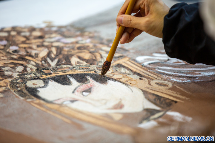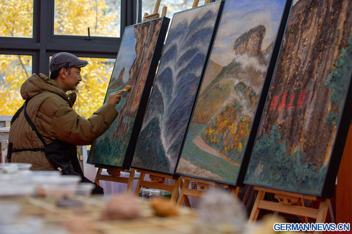 WUYISHAN, 25. Dezember 2025 (Xinhua) -- Ein Künstler arbeitet an einem Gemälde mit Farben aus Gesteinspigmenten in der Stadt Wuyishan in der Provinz Fujian im Südosten Chinas, 5. Dezember 2025. Wuyishan verfügt über eine große Vielfalt an farbenfrohen Gesteinen und Erden, die als natürliche Palette für die Malerei dienen und die unverwechselbare Wuyi-Gesteinspigmentkunst hervorgebracht haben. Durch die Integration moderner künstlerischer Elemente und Techniken in die Tradition wird die Wuyi-Gesteinspigmentmalerei allmählich zu einem einzigartigen kulturellen Merkmal von Wuyishan. (Foto von Chen Ying/Xinhua)
