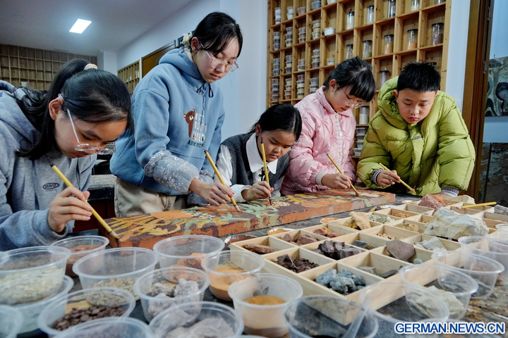 WUYISHAN, 25. Dezember 2025 (Xinhua) -- Kinder arbeiten an einem Gemälde mit Farben aus Gesteinspigmenten in der Stadt Wuyishan in der Provinz Fujian im Südosten Chinas, 20. Dezember 2025. Wuyishan verfügt über eine große Vielfalt an farbenfrohen Gesteinen und Erden, die als natürliche Palette für die Malerei dienen und die unverwechselbare Wuyi-Gesteinspigmentkunst hervorgebracht haben. Durch die Integration moderner künstlerischer Elemente und Techniken in die Tradition wird die Wuyi-Gesteinspigmentmalerei allmählich zu einem einzigartigen kulturellen Merkmal von Wuyishan. (Foto von Chen Ying/Xinhua)
